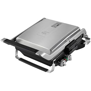 Sporting a sleek, contemporary design in durable housing, this stainless-steel countertop grill features 100 square inches of cooking surface and a 1-1/2-inch floating hinge for top melting and to accommodate thick grilled-cheese sandwiches, broiled fish, hamburgers, and more. The appliance provides three removable plates--two ribbed grill plates and one griddle/bake plate--that come with cool-touch handles and offer exceptional versatility... Read More...