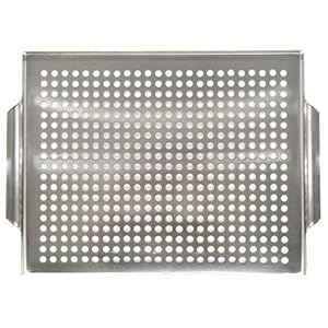 This stainless steel grill topper cooks delicate mushrooms, cherry tomatoes, or scallops over the grill without losing them to the depths below. The large, 16-by-12-inch grilling tray can grill a plethora of veggies or seafood. A perforated bottom lets heat circulate evenly through food for precise cooking. The topper has three 1-inch sides to keep food contained during grilling and one open side to slide cooked food out. Handles on either ... Read More...