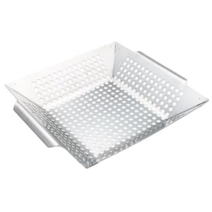 Grilled seafood and vegetables taste fantastic, but have a tendency to fall through the grill. This 12-inch-square stainless-steel wok with wide molded handles sits directly on a gas or charcoal grill and keeps stir-fried veggies, shrimp, scallops and other small foods contained and easy to turn. A grid of small round holes on the bottom and sides allows heat to circulate evenly and lets vegetables steam from dripping juices. Measuring 2-3/... Read More...