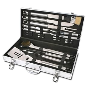 Style Asia Chefs Basics Select 18 Piece Stainless Steel BBQ Set includes everything you need for your barbeque meal; set has a slotted turner with tenderizer and built in bottle opener, jumbo tongs, grill cleaning brush, heavy duty barbeque fork, 8 inch all purpose knife, gourmet basting brush, 4 steak knives, 8 corn holders, all in a lined polished aluminum storage case.